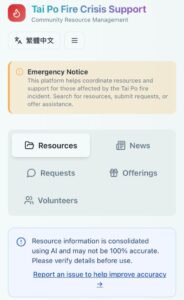 In den letzten Tagen sind zahlreiche Hilfsangebote von Regierung und Unternehmen für die Bewohner von Wang Fuk Court eingegangen. Die Regierung hat 300 Mio. HKD (33 Mio.€) als Katastrophenhilfe zugesagt, und Unternehmen wie Henderson Land und Sino Group haben ebenfalls Millionenbeträge gespendet. Allerdings handelt es sich hierbei lediglich um Almosen. Inmitten intensiver staatlicher Repressionen und des Versagens der Regierungsführung bleibt die Bürgergesellschaft (5) der reaktionsfähigste Akteur bei Katastrophen. Dank der technologischen Infrastruktur und der Informationsgewohnheiten, die während des Aufstands von 2019 und der Covid-19-Pandemie entwickelt wurden, konnten innerhalb weniger Stunden enorme Ressourcen von Einzelpersonen, kleinen Unternehmen und NGOs mobilisiert werden.