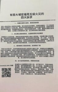 Im Fall des Wang Fuk-Feuers ist es aber unmöglich, die Medien und die Öffentlichkeit daran zu hindern, den Ort des Geschehens zu erreichen und mit den Opfern der Katastrophe in Kontakt zu treten. Die Menschen stellen bereits konsequente Forderungen. Auf einem Flugblatt, das am 28. November in Tai Po verteilt wurde, waren vier Forderungen aufgeführt: