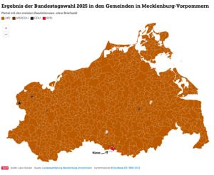 Ganz Mecklenburg-Vorpommern wählt die AfD … ganz Mecklenburg? Nein! Da gibt es noch Kieve, ein Dorf mit 140 Einwohner*innen direkt an der Grenze zu Brandenburg. Die Gemeinde ist die einzige in Ostdeutschland, in der die SPD bei der Bundestagswahl 2025 stärkste Kraft wurde, ein roter Fleck auf den Wahlkarten. Überall drumherum war die AfD am stärksten, im Nachbardorf kam sie auf 46 Prozent.
