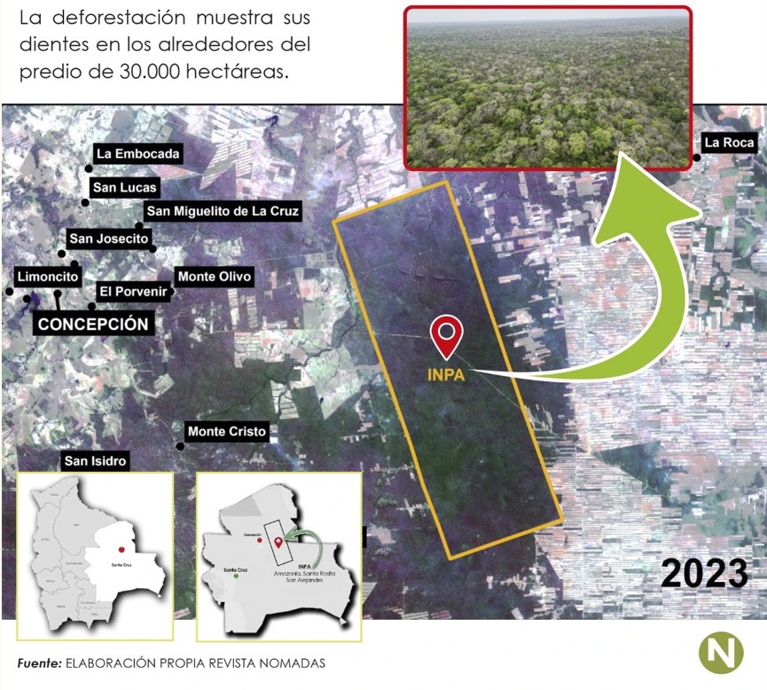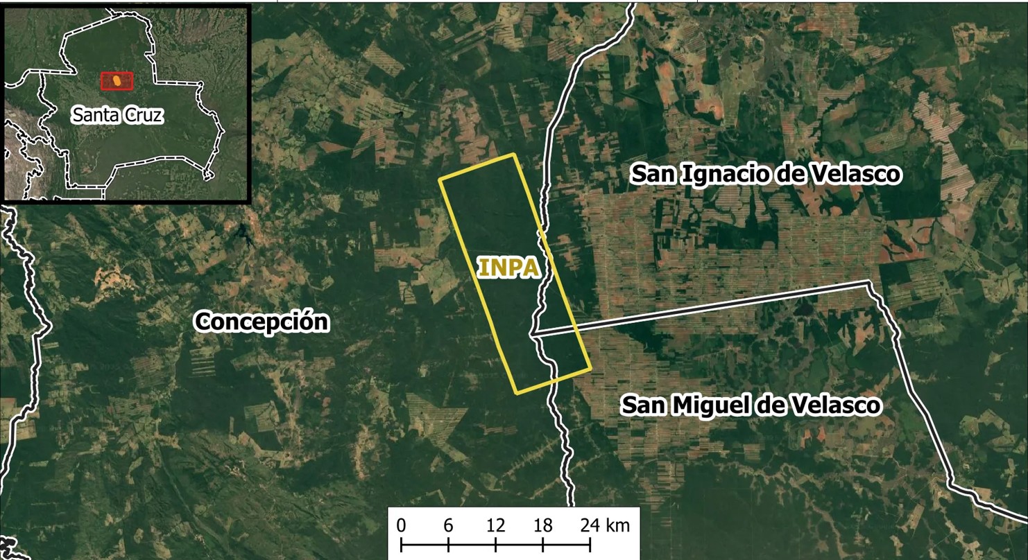 Dieses letzte Naturparadies in der Region hat einen Namen: INPA. Die 30.019 Hektar sind seit dem Jahr 2001 im Privatbesitz einer bolivianisch-niederländischen Familie, die in den letzten Jahrzehnten dort nachhaltige Forstwirtschaft betrieben und Edelholz gewonnen hat. Zwischen 2021 und 2023 hat diese Firma unter dem Namen INPA Parket LTDA Holz im Wert von jährlich etwa 700.000 US-Dollar exportiert (über eine eigene Fabrik in Paraguay werden Parkettböden dann zur Weiterverarbeitung in die Niederlande und von dort auch nach Deutschland exportiert, Anm. d. Übers.). Das Unternehmen erhielt für seine Aktivitäten und den größten Teil der Produktion das FSC Zertifikat des Forest Stewardship Council für nachhaltige Holzwirtschaft. In Bolivien wurden gegen die Firma jedoch politischer Druck ausgeübt und wurden diverse Gerichtsverfahren angestrengt. Zudem haben Bodenspekulanten wiederholt versucht, das Land zu besetzen.