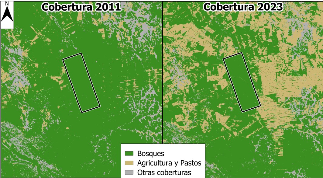 Bis zum Jahr 1996 gab es in einem Radius von 40 Kilometern um den Landbesitz auf einer Fläche von über 500.000 Hektar praktisch keinen Waldverlust. Bis zum Jahr 2012 gingen nur 28.016 Hektar bzw. weniger als 6 Prozent der Waldfläche verloren. 86 Prozent der Fläche war noch mit Wald bedeckt. 41 Prozent waren staatliches Land, knapp 20 Prozent gehörte Privatunternehmen, jeweils knapp zehn Prozent waren kleinbäuerliche Dorfgemeinden oder mittlere landwirtschaftliche Betriebe. Hinzu kamen 7% indigenes Territoriumen und knapp 6 Prozent Kleinbetriebe. Doch danach wurden 127.988 Hektar Wald zerstört. Zwischen 2021 und 2023 war der Verlust mit jeweils über 10.000 Hektar am größten. Beteiligt waren auch Siedlungen von Mennoniten, die sich in den vergangenen Jahren stark ausgeweitet haben.