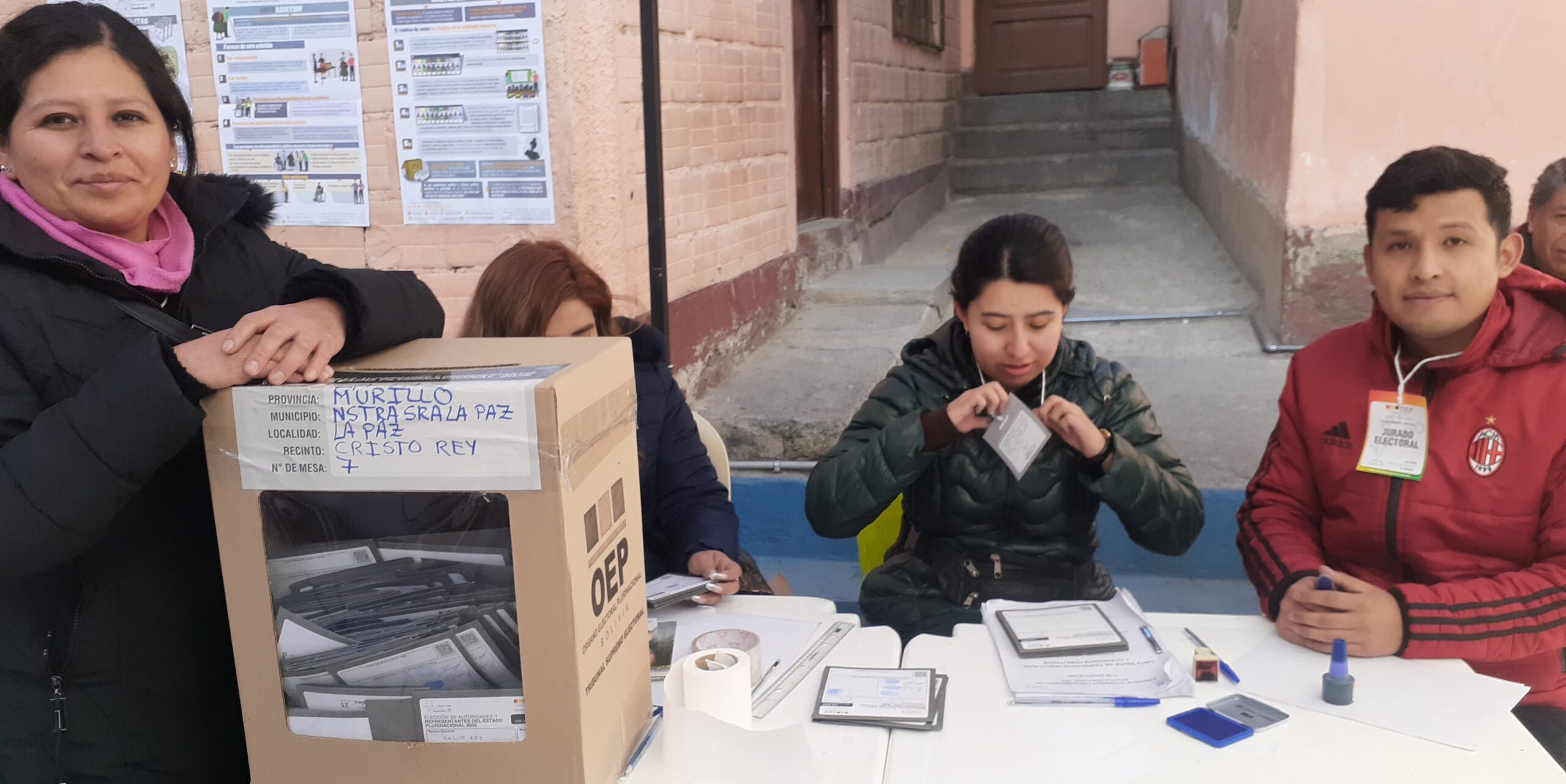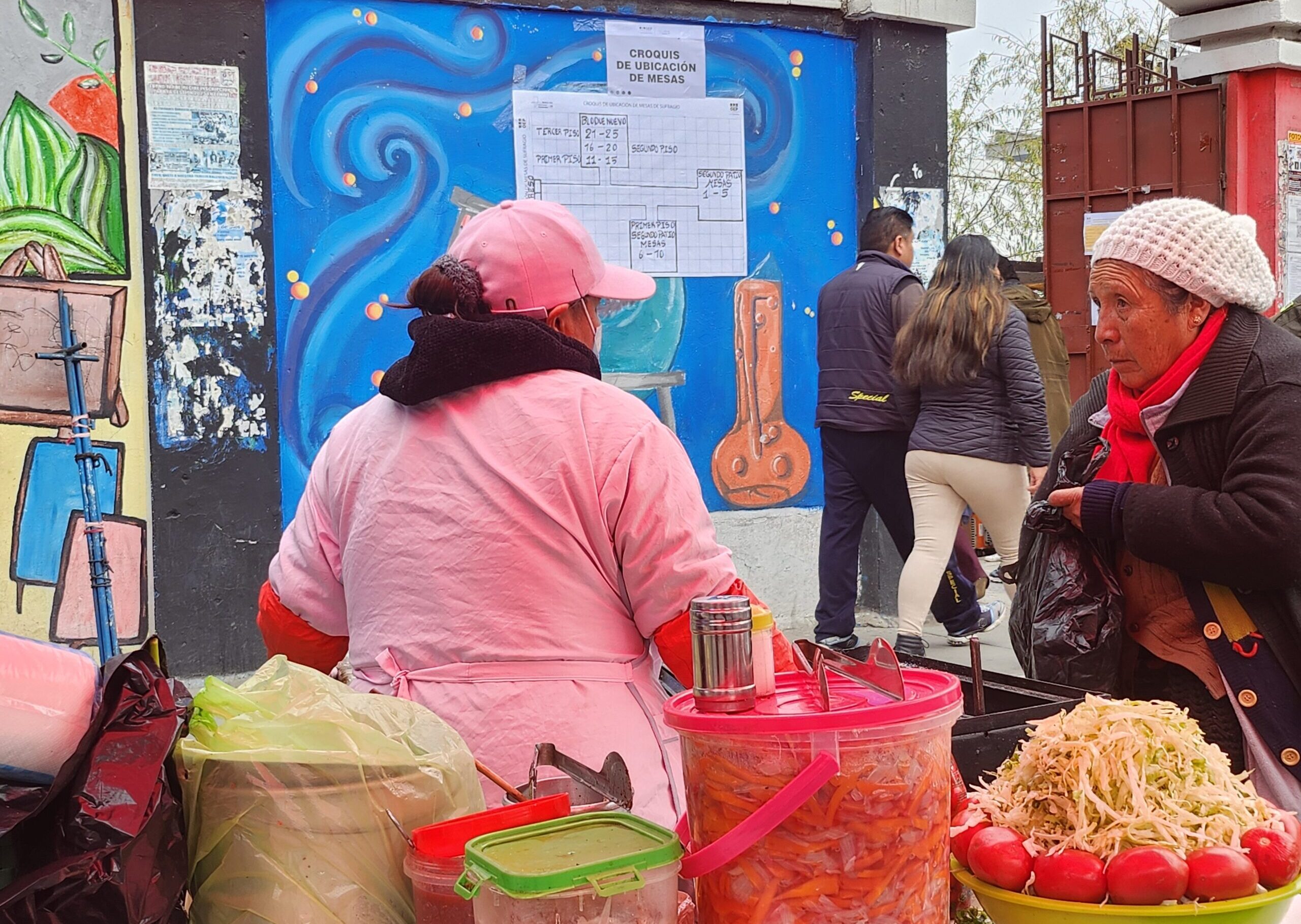 Morgens um 8:00 Uhr, als die Wahlbüros in der Hugo Dávila Schule im Miraflores-Viertel von La Paz öffnen, ist es noch kalt und wenig Betrieb. Vor dem Tor werden Sandwiches mit gebratenem Schweinefleisch, frittierte Mehlkuchen und heißes Maisgetränk verkauft.