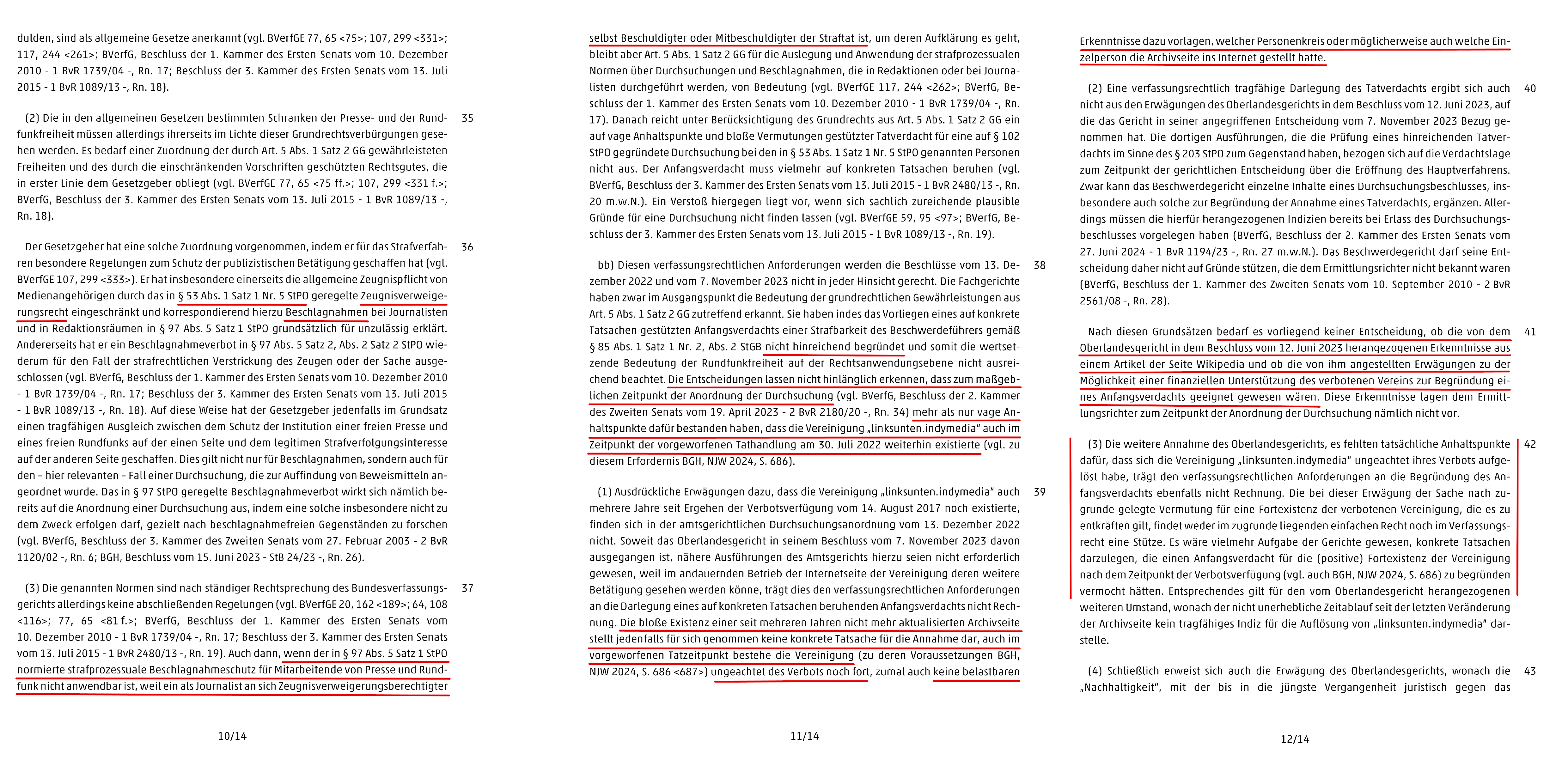 Den „verfassungsrechtlichen Anforderungen werden die Beschlüsse [des Amtsgerichts Karlsruhe] vom 13. Dezember 2022 und [des OLG Stuttgart] vom 7. November 1923 nicht in jeder Hinsicht gerecht. Die Fachgerichte […] haben […] das Vorliegen eines auf konkrete Tatsachen gestützten Anfangsverdachts einer Strafbarkeit des Beschwerdeführers gemäß § 85 Abs. 1 Satz 1 Nr. 2, Abs. 2 StGB [Unterstützung einer aus bestimmten Gründen unanfechtbar verbotenen Vereinigung] nicht hinreichend begründet […]. Die Entscheidung lassen nicht hinlänglich erkennen, dass zum maßgeblich Zeitpunkt der Anordnung der Durchsuchung […] mehr als nur vage Anhaltspunkte dafür bestanden haben, dass die Vereinigung ‚linksunten.indymedia‘ auch im Zeitpunkt der vorgeworfenen Tathandlung am 20. Juli 2022 weiterhin existierte (vgl. zu diesem Erfordernis BGH, NJW 2024, S. 686).“