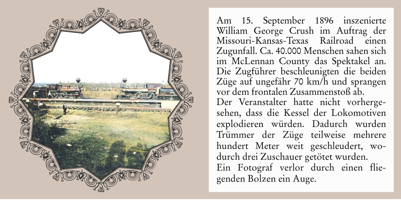Die Katy hatte mit sinkenden Ticketverkäufen zu kämpfen und solche Kollisionen sahen die Leute gern. Die Werbeaktion war ein Sinnbild für die zerstörerische Kraft des Kapitalismus. Monatelang hatte die Katy die zwei ausrangierten Lokomotiven auf eine Werbetour durch ganz Texas geschickt, um für die große Karambolage zu werben. Die Fahrscheine nach Crush kosteten pauschal zwei Dollar, der Eintritt war frei. William Crash ritt auf einem Schimmel vor der Menschenmenge auf und ab. Der Organisator des dekadenten Spektakels hatte die kleine Stadt für einen einzigen Tag ins Nirgendwo gebaut und sie nach sich selbst benannt. Die Massen lechzten nach dem großen Knall und mussten von Polizisten zurückgedrängt werden. Scott sog die seltsame Atmosphäre in sich auf. Die beiden Züge wurden langsam an die entgegengesetzten Enden des Gleisstücks gefahren. Gleich würde es tatsächlich losgehen. Die Schienen waren mit kleinen Feuerwerkskörpern präpariert, um die Kollision noch effektvoller zu gestalten. William Crash hielt seinen Hut in die Höhe. Es wurde totenstill. Dann riss er den Arm nach unten und die Lokführer gaben Dampf. – Ein Marsch, ja ein Marsch wäre genau das Richtige, Texaner liebten Märsche! Scott würde einen Marsch über das Spektakel komponieren, mit allem drum und dran, inklusive dem Pfeifen vor dem Crash.